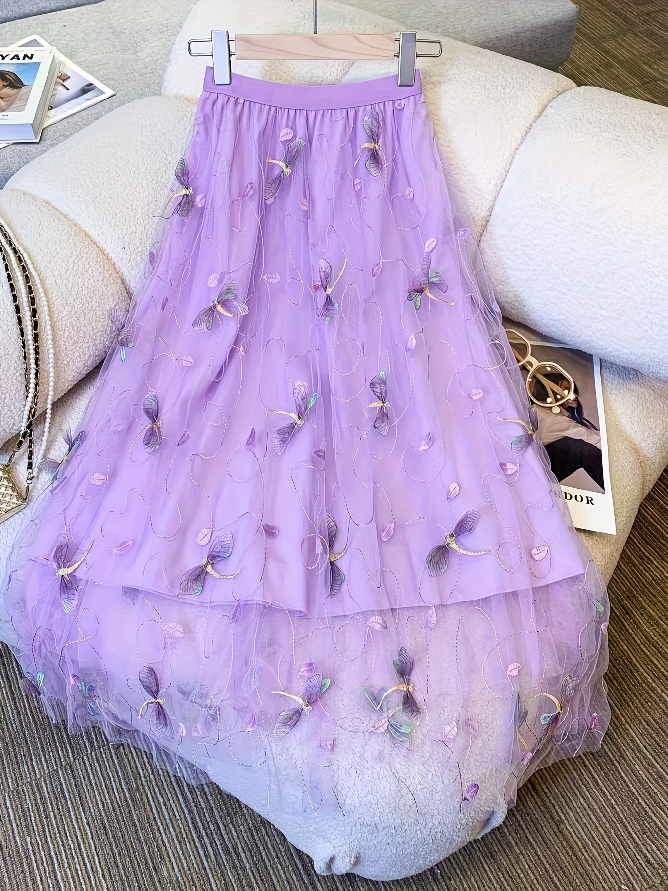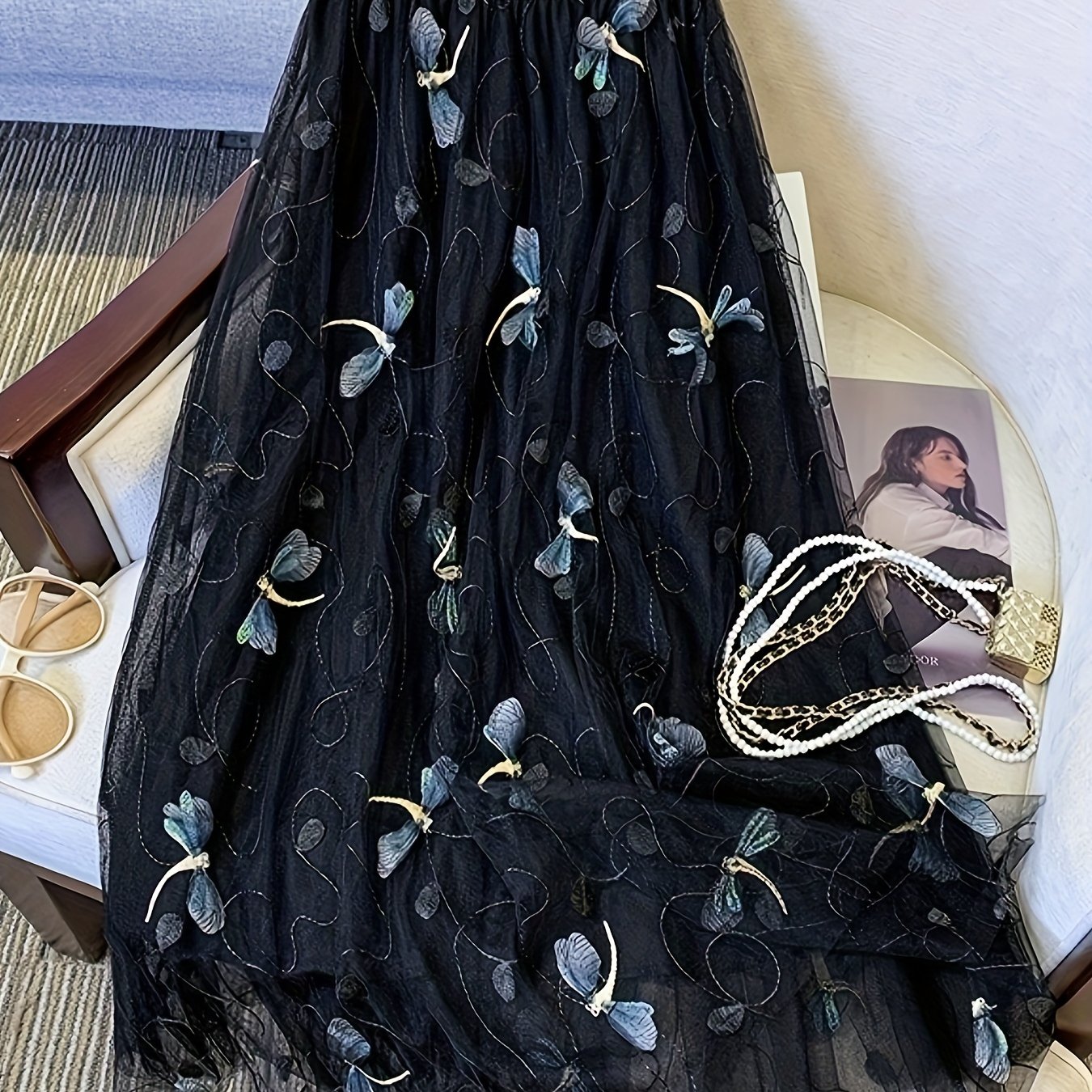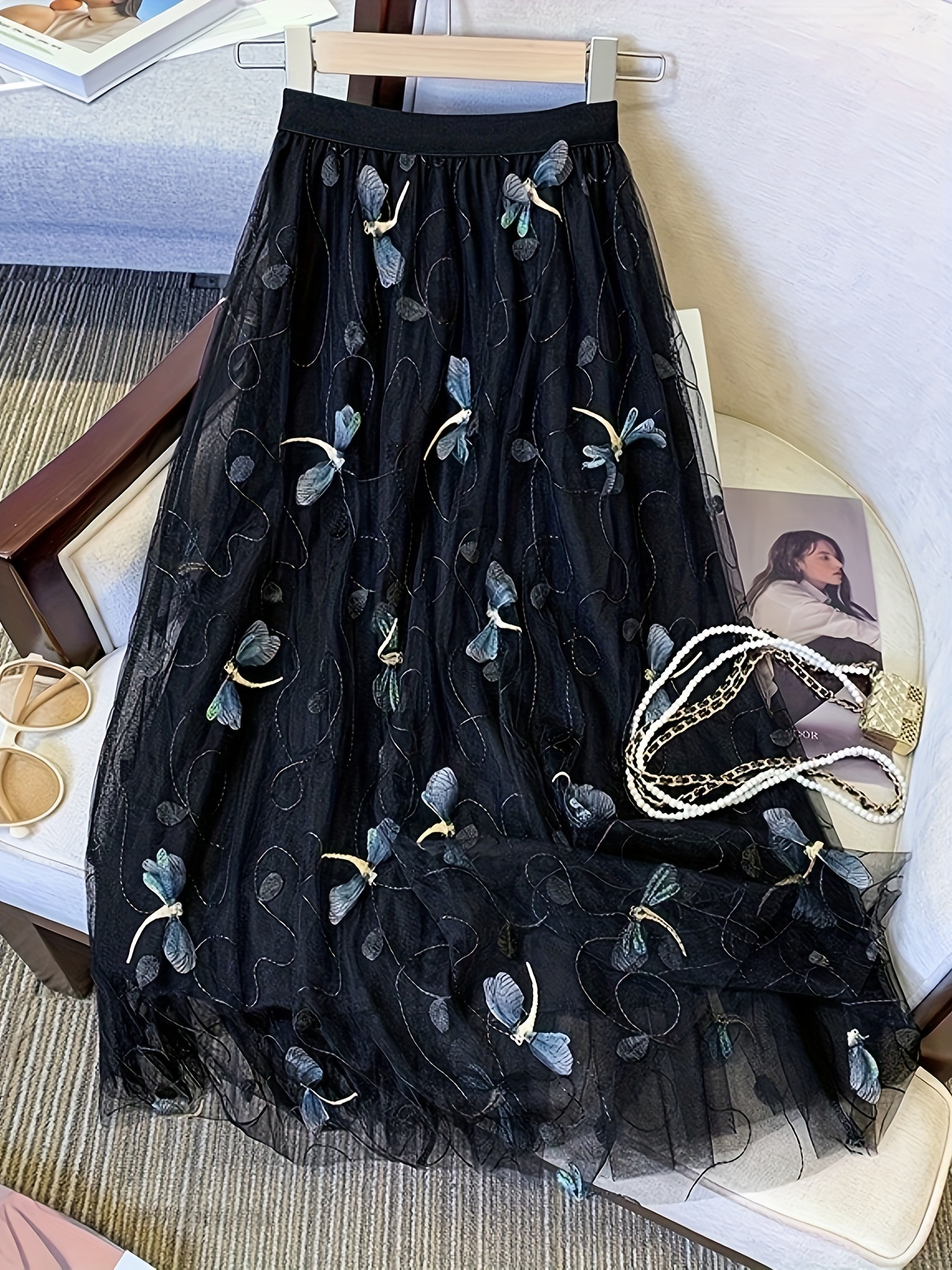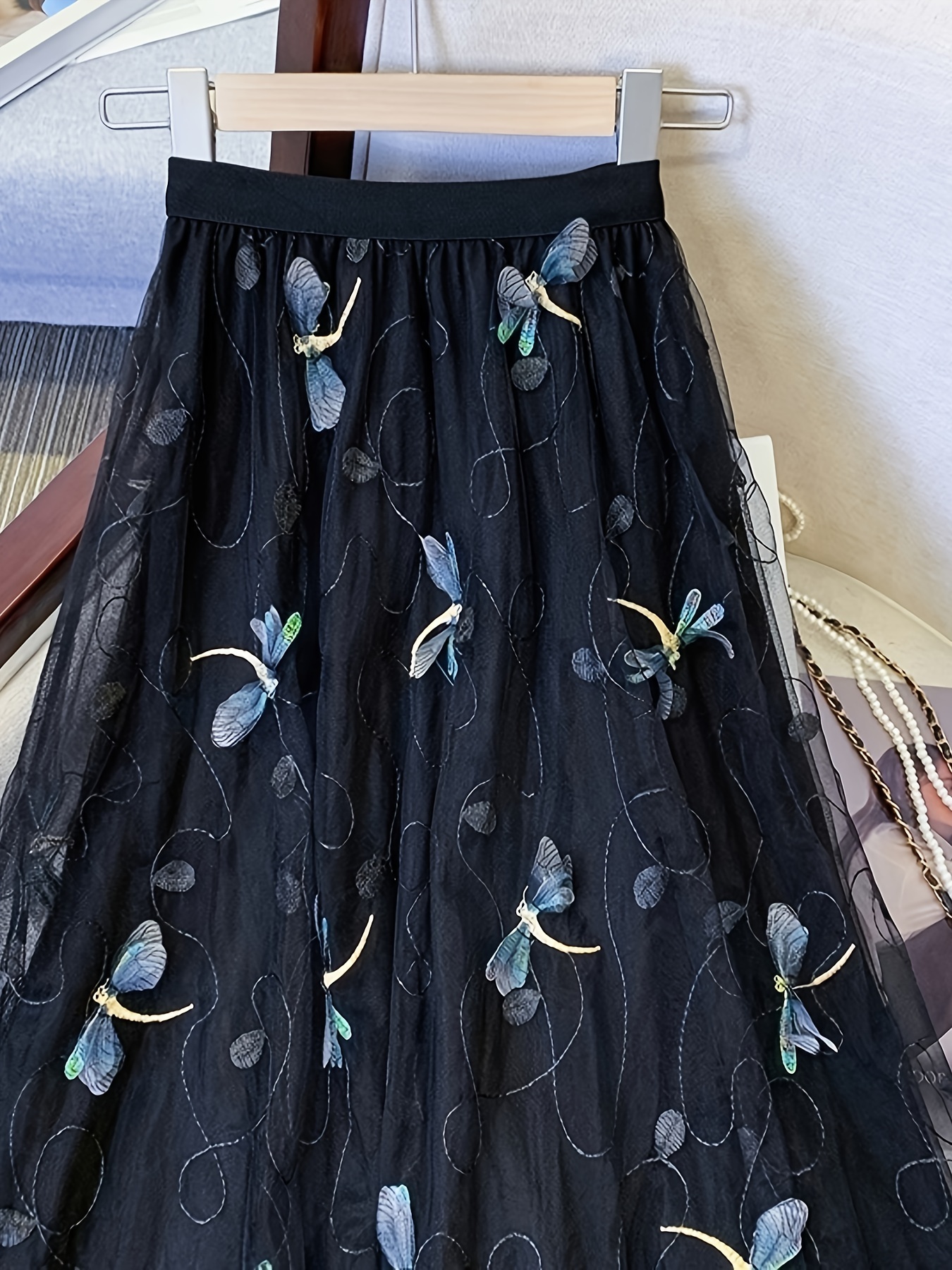 Dragonfly Applique Tulle Skirt, Casual Elastic Waist Skirt, Women's Clothing