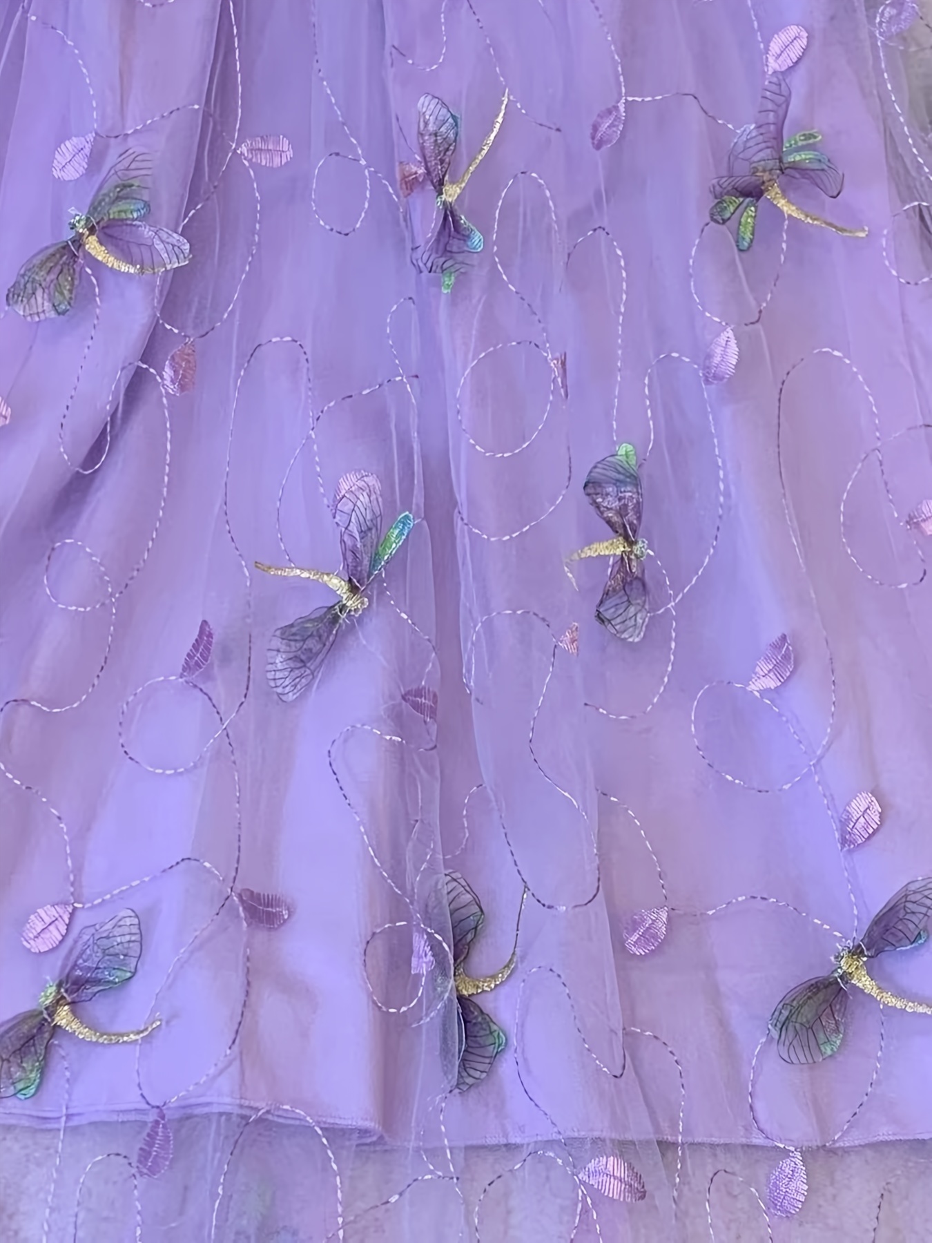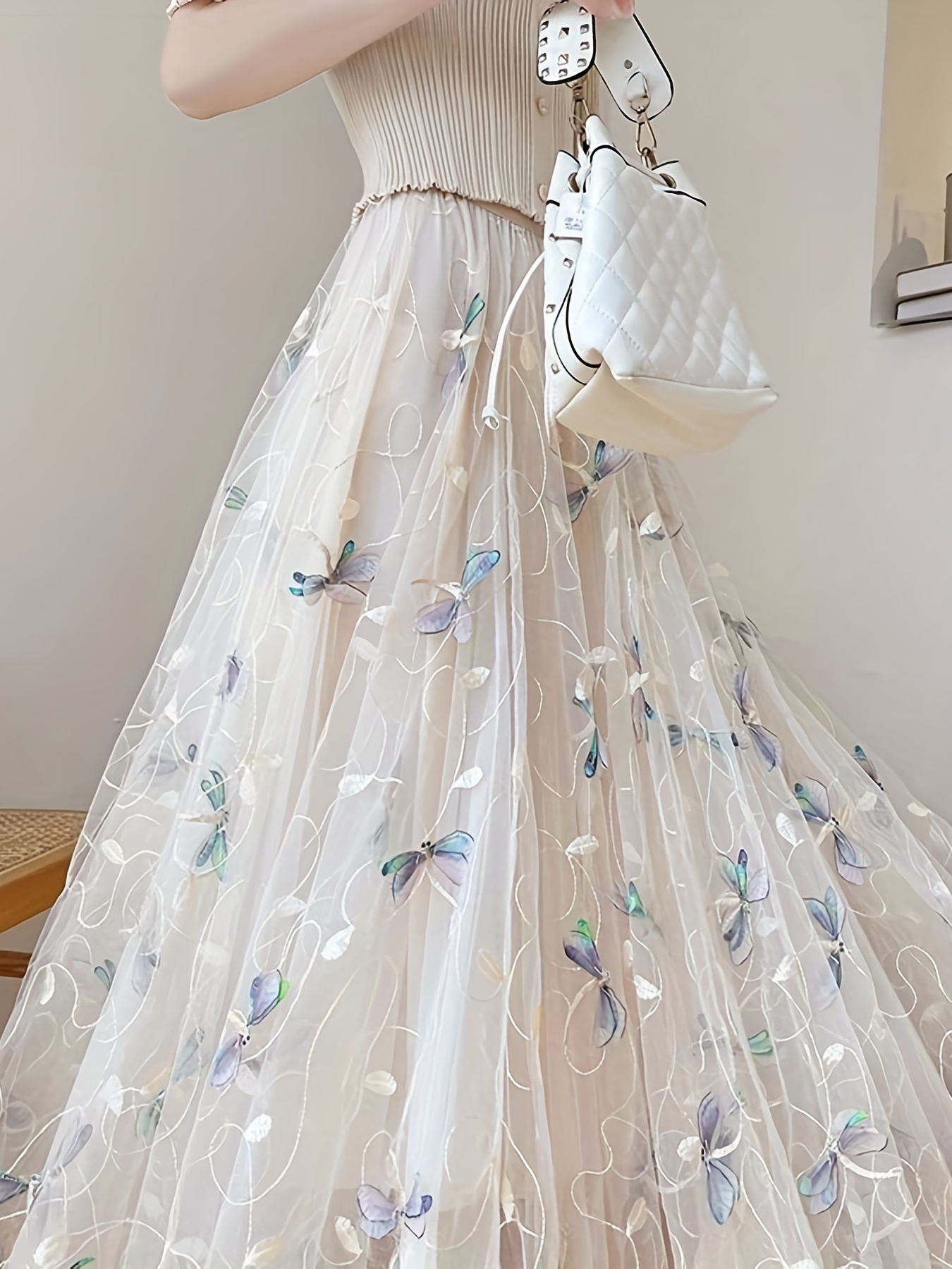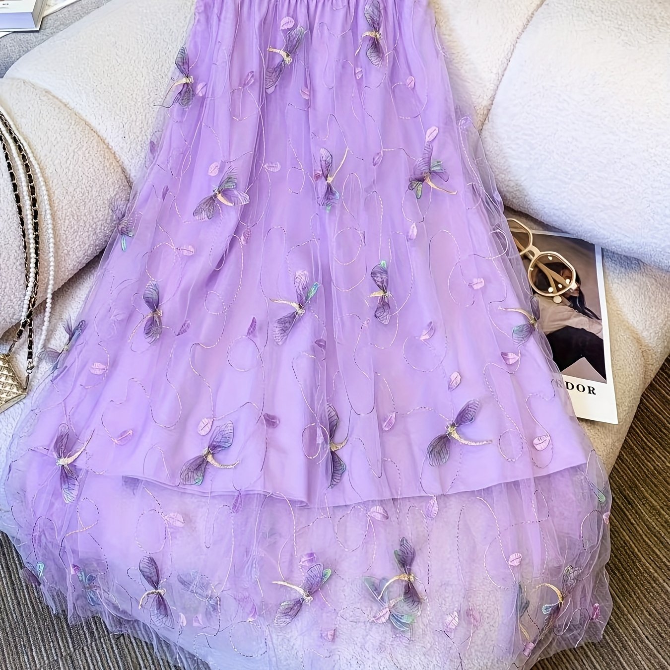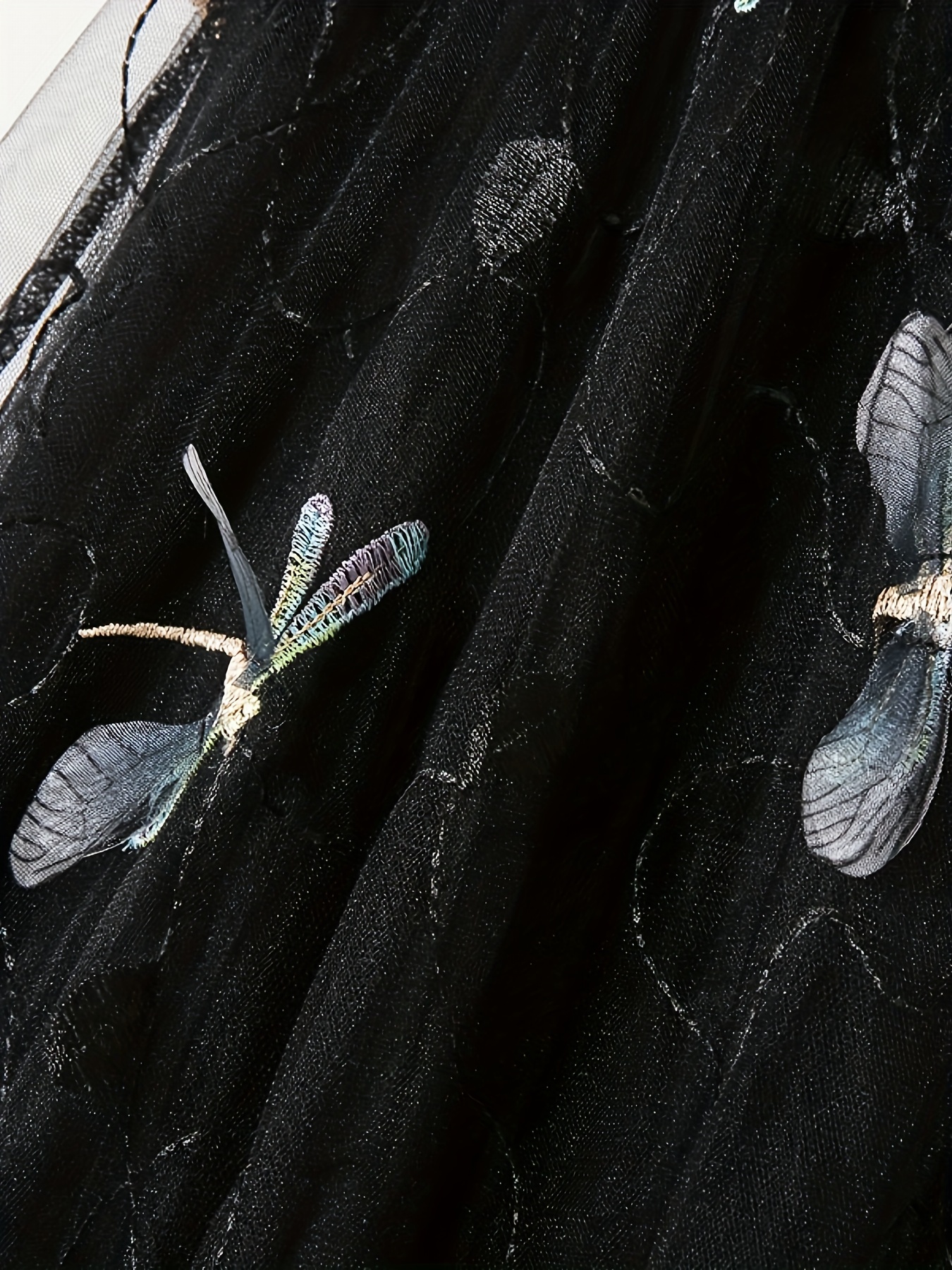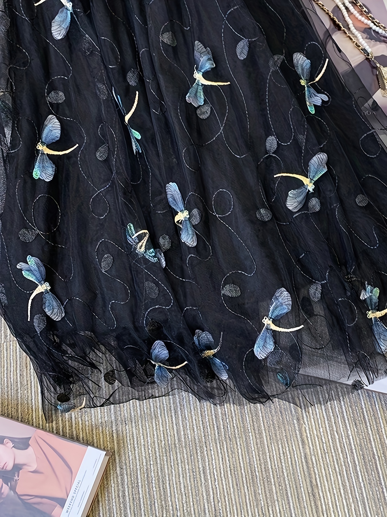 Dragonfly Applique Tulle Skirt, Casual Elastic Waist Skirt, Women's Clothing