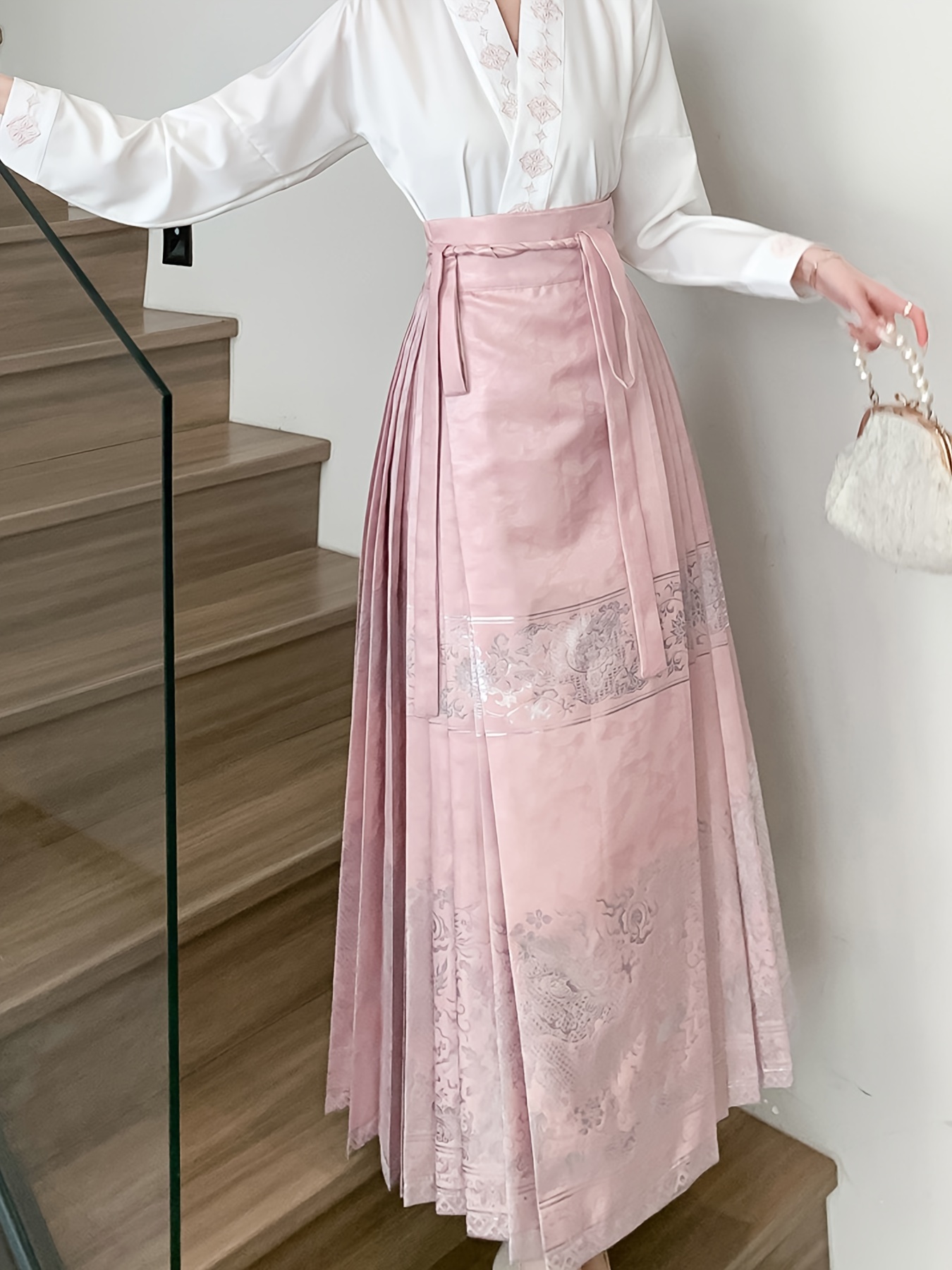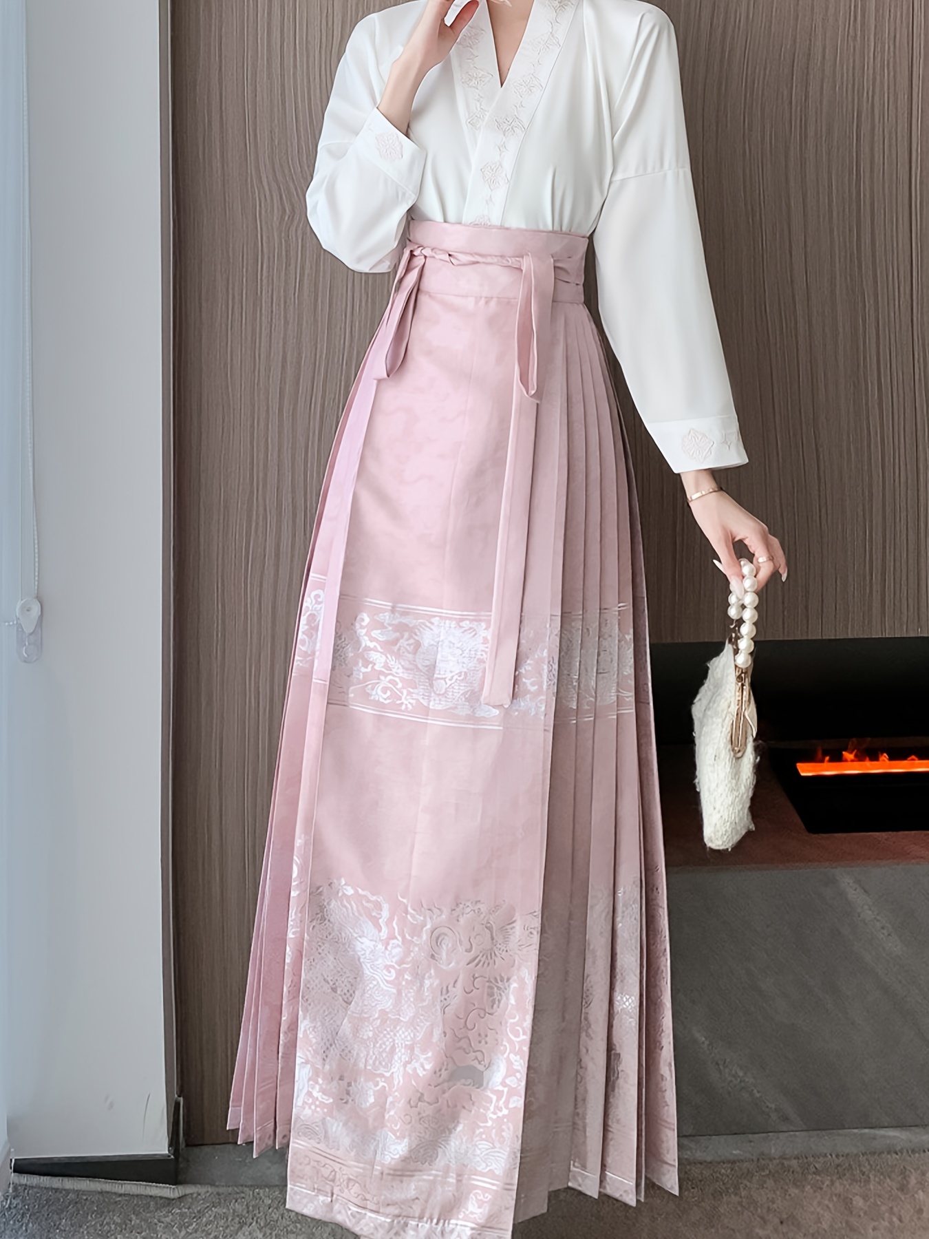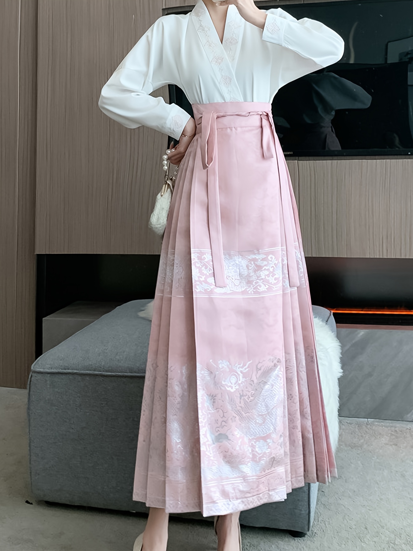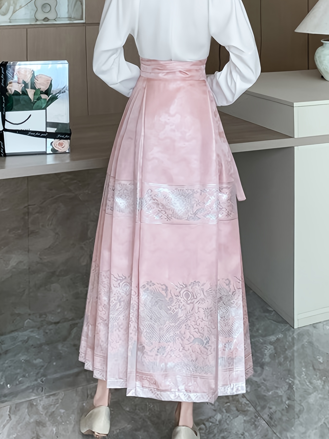 Floral Print High Waist Skirt, Casual Pleated Tie Waist Chinese Horse Face Skirt For Festival, Women's Clothing