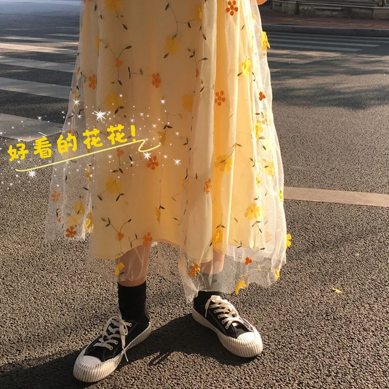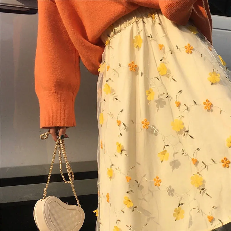New Women's Yellow 3D Flower Lace High Waist Mesh Elegant Skirt